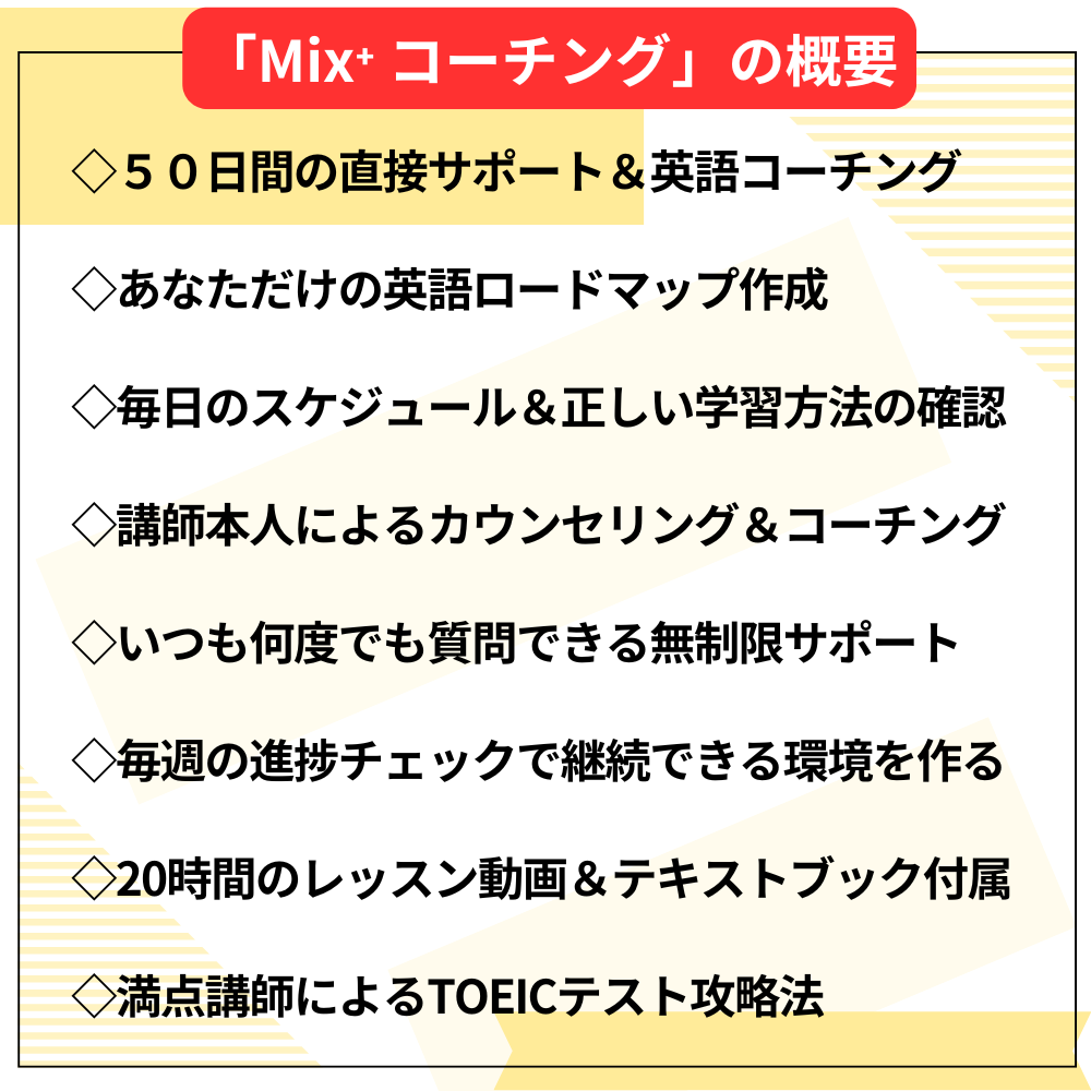 「Mix⁺ コーチング」はもちろん英語力そのものを伸ばすためにも有効ですが、それ以上に「最速&最短の英語ロードマップの作成」や「正しい考え方」そして「独学習慣」を身につけて頂くことが一番の目的です。