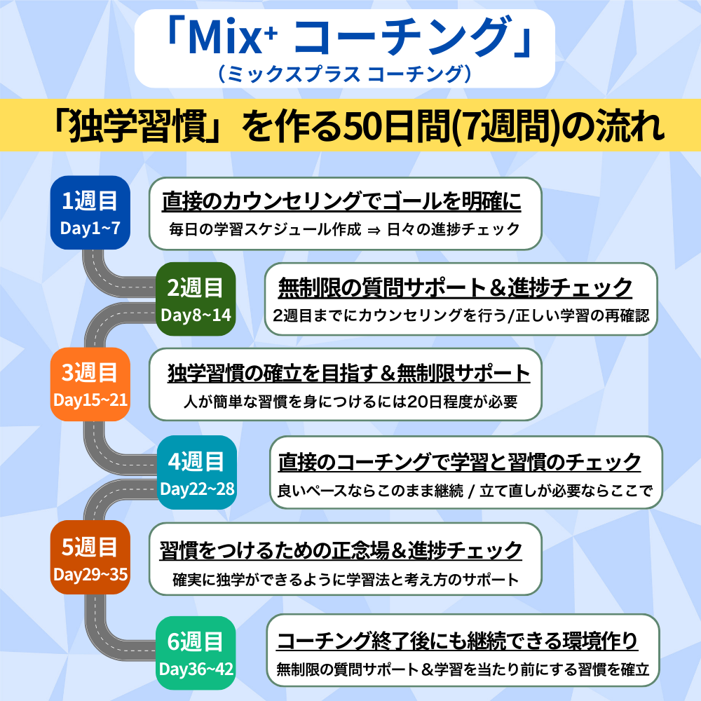 「Mix⁺ コーチング」は「学習の目的(理由)」を明確にして「独学習慣」を身につけるための英語コーチングです。